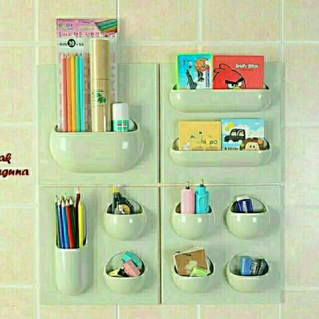 Juga bisa dipasang di ruang belajar untuk tempat alat tulis. Atau di kamar tidur untuk tempat kosmetik. Atau di samping pintu, untuk tempat kunci