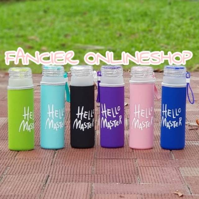 Botol Minum "Hello Master" + Free Sarung, bahan kaca hadir dengan berbagai pilihan warna yang tersedia untuk menyimpan berbagai minuman favorit Anda.